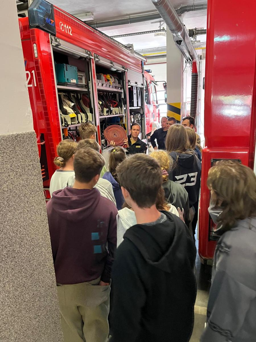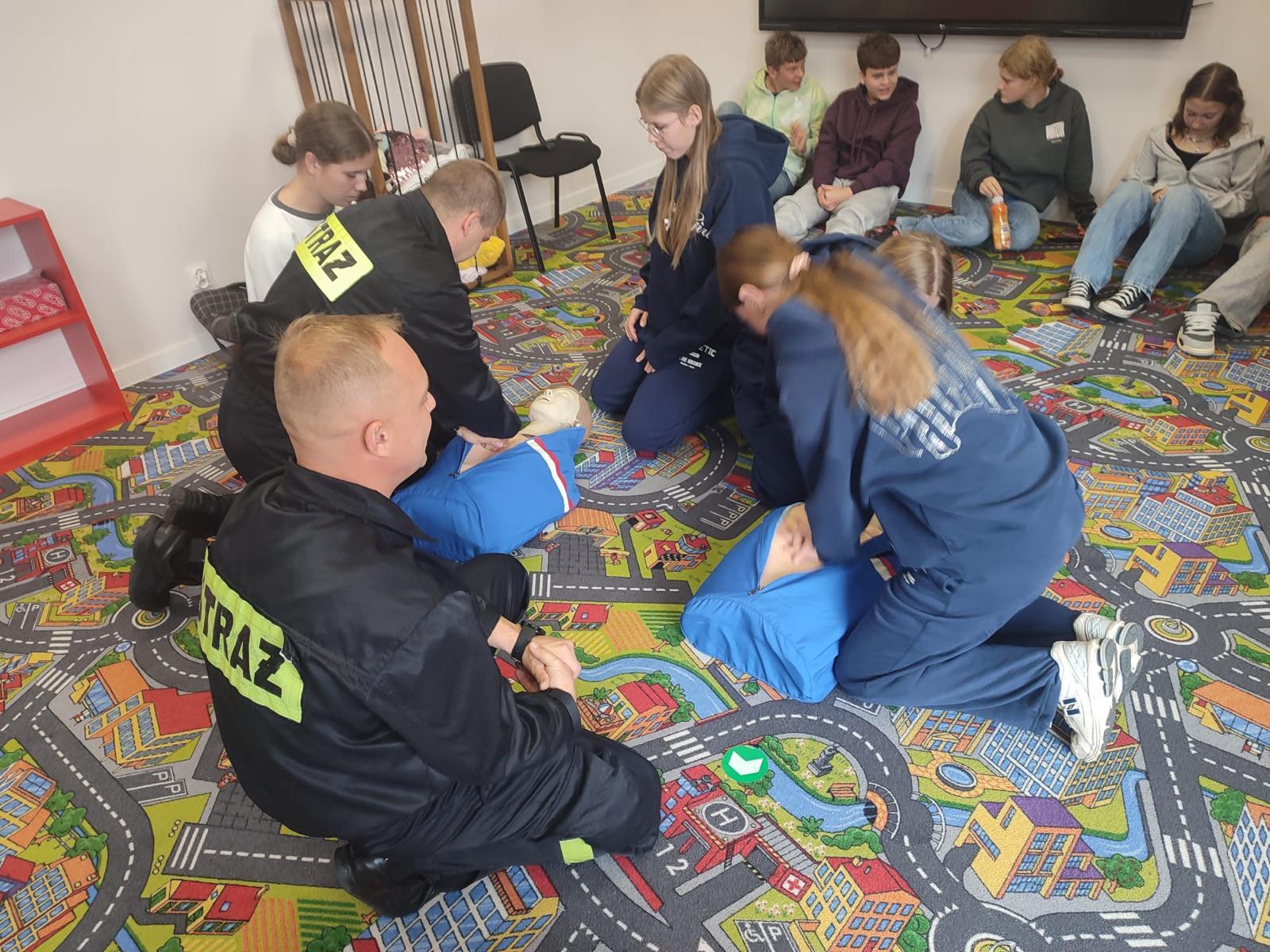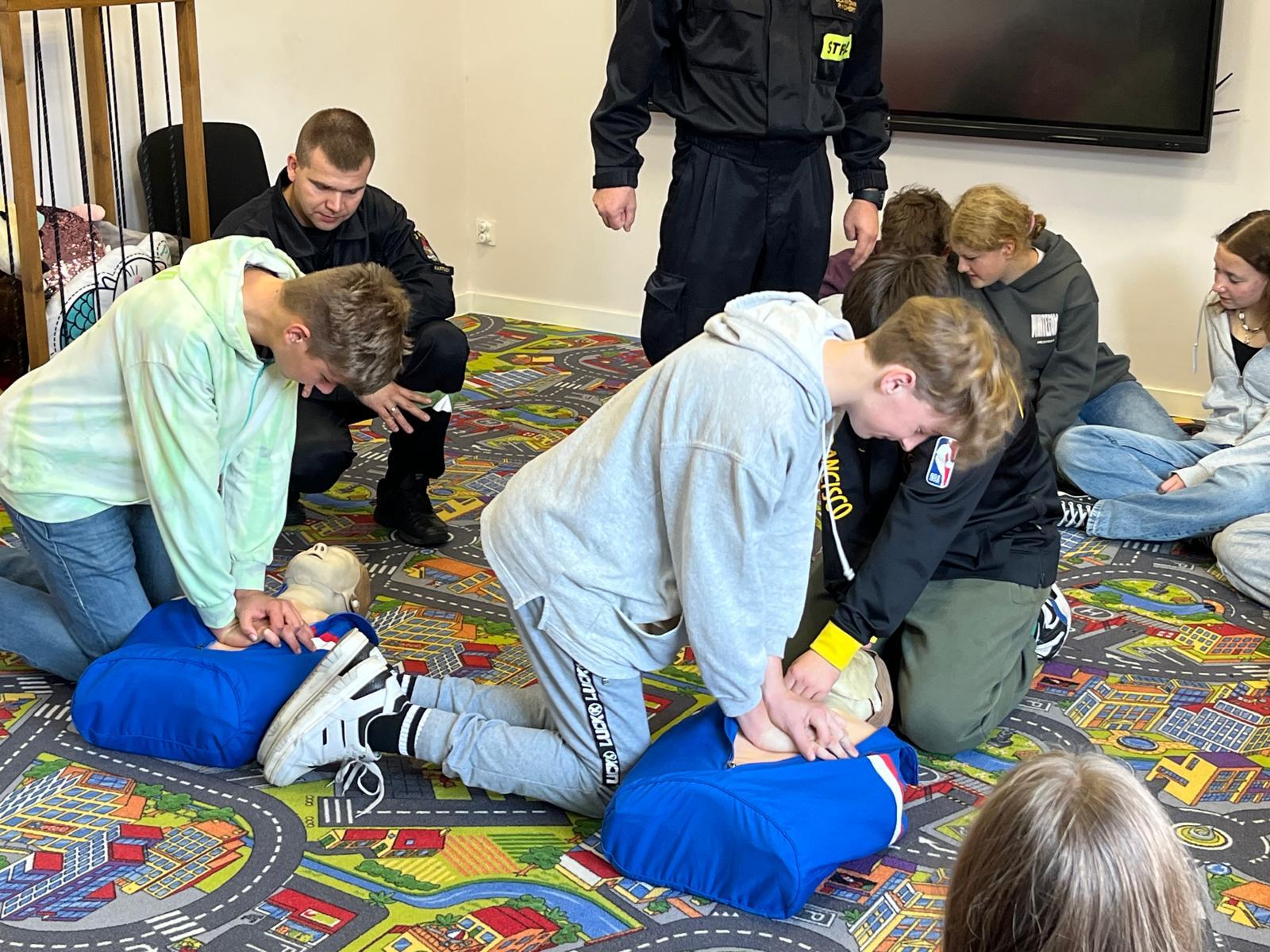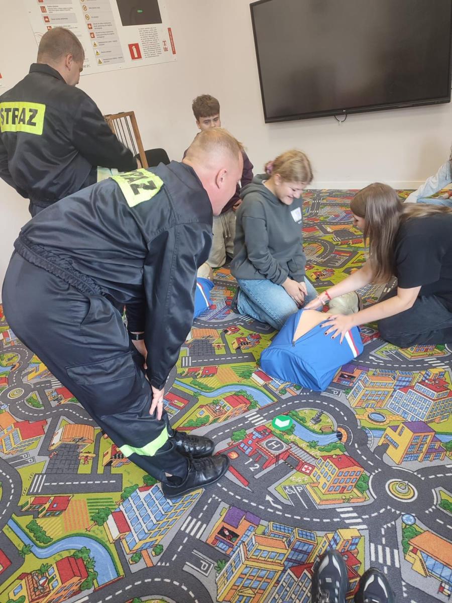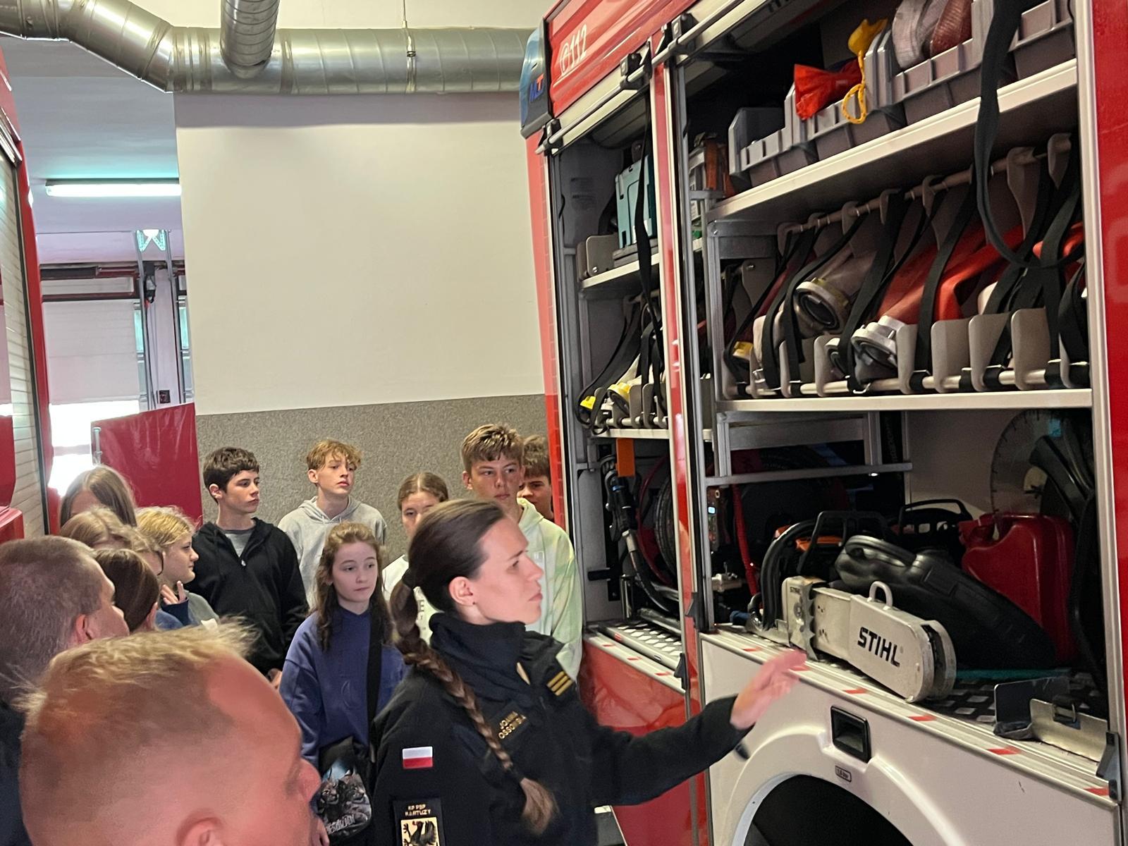 Po zajęciach na strzelnicy uczniowie w ramach doradztwa zawodowego uczestniczyli w spotkaniu ze strażakami w Straży Pożarnej w Kartuzach. Dowiedzieli się o specyfice pracy w tym zawodzie, o sposobach zdobycia zawodu strażaka i pracy w straży zawodowej. Na koniec spotkania odbyły się warsztaty z udzielania pierwszej pomocy.