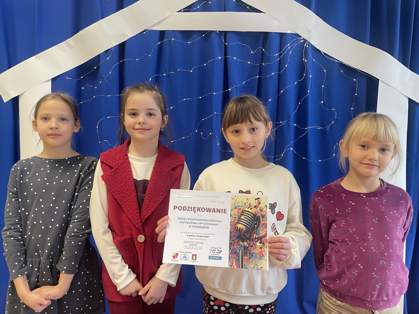 Dnia 21.05.2024r. wręczono nagrodę laureatce V Ogólnopolskiego Konkursu Plastycznego „Majówka z flagą w tle” z Przedszkola Miejskiego nr 2 w Olsztynie. Patronat honorowy nad konkursem objął: Prezydent Olsztyna Piotr Grzymkiewicz, Warmińsko – Mazurski Kurator Oświaty. Patronat medialny nad konkursem objęło Polskie Radio Olsztyn. Uroczyste podsumowanie konkursu odbyło się podczas obchodów Dnia Flagi RP. Z naszej szkoły w konkursie brała udział Barbara Banasik z Przedszkola w Dzierżążnie i Michał Paprocki ze świetlicy szkolnej dzieci młodszych.