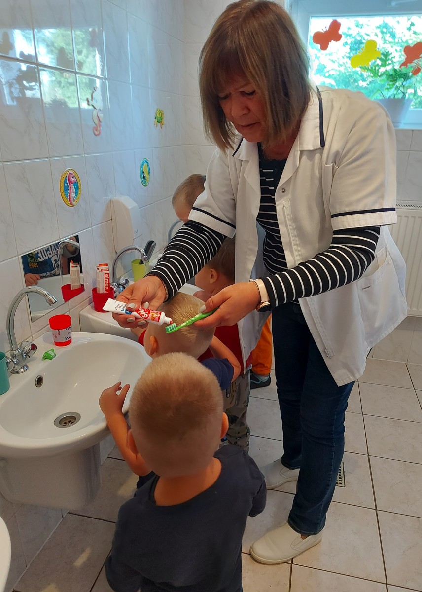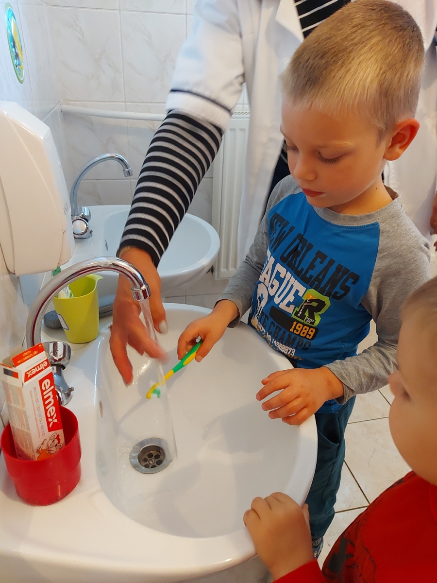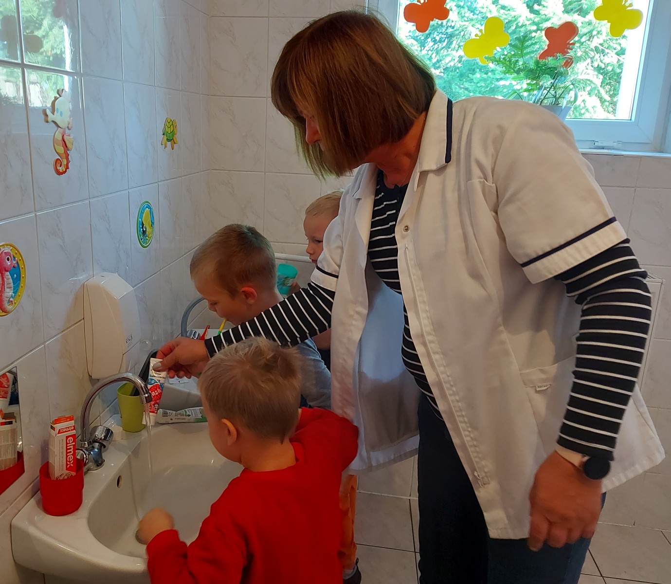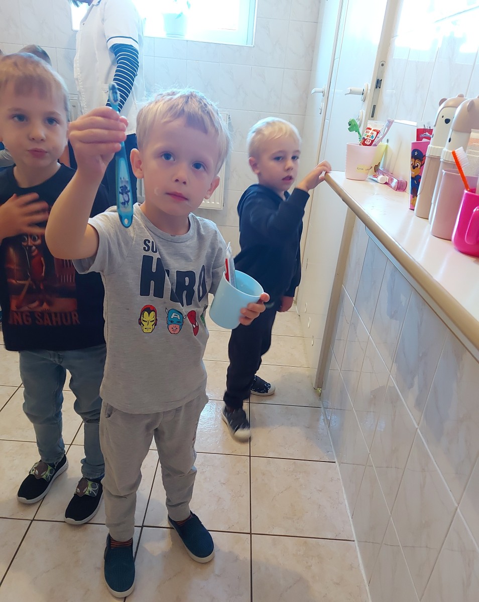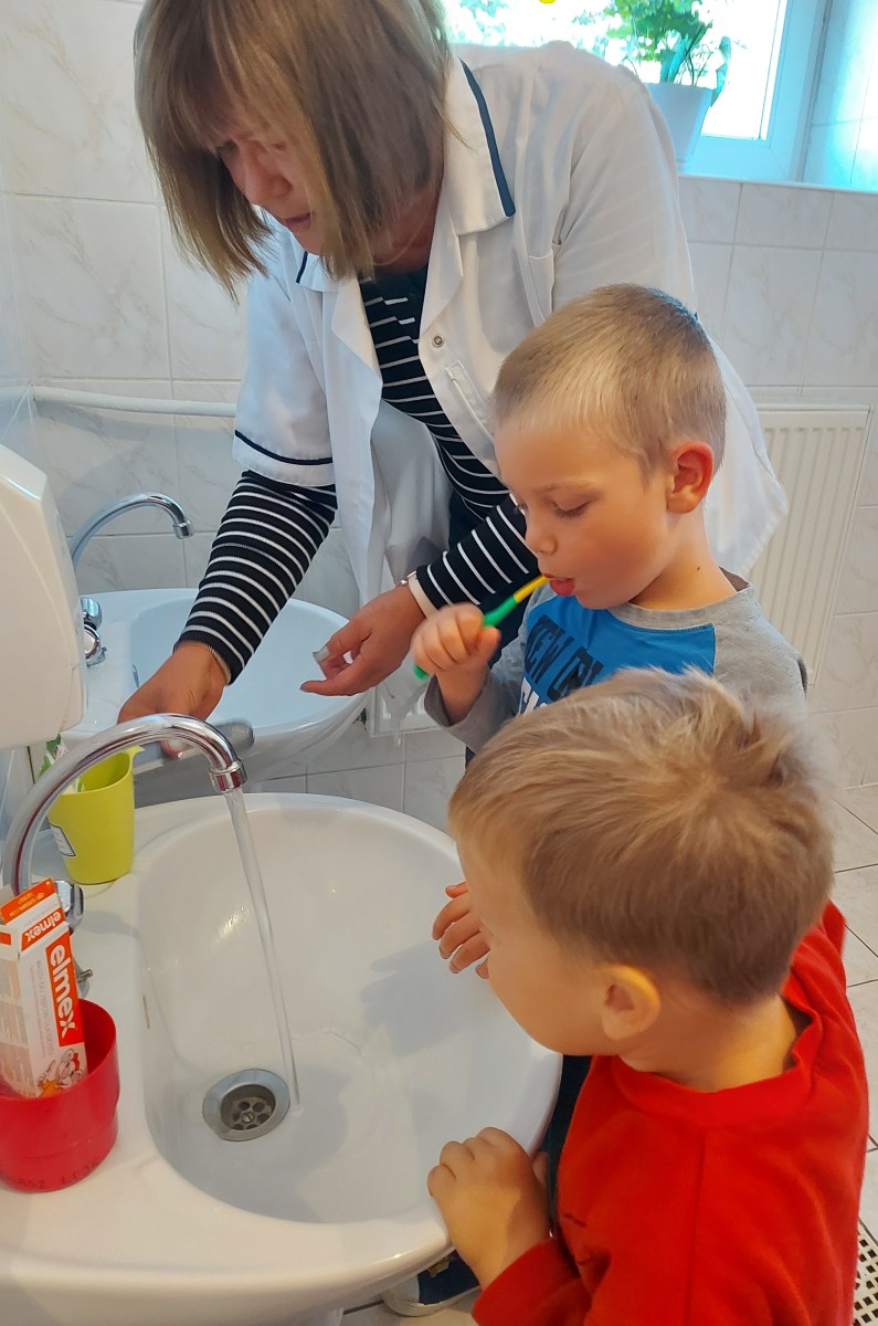 Dzieci dowiedziały się, w jaki sposób i kiedy myjemy zęby, aby były piękne i zdrowe, które produkty wzmacniają zęby, jakie są dla nich szkodliwe oraz jak powstaje próchnica, że występowanie próchnicy ma związek ze spożywaniem pokarmów słodkich. Cukier z pożywienia kontaktujący się bezpośrednio z powierzchnią zębów, wpływa na zmianę naturalnie występującej w jamie ustnej flory bakteryjnej. Pani pielęgniarka zachęcała dzieci do leczenia zębów mlecznych u stomatologa, higieny jamy ustnej i zdrowego odżywiania, spożywania dużo owoców i warzyw. Wszystkie dzieci z panią pielęgniarką myły zęby w przedszkolnej łazience zgodnie z ustalonymi zasadami prawidłowego szczotkowania i przestrzegania kultury osobistej.