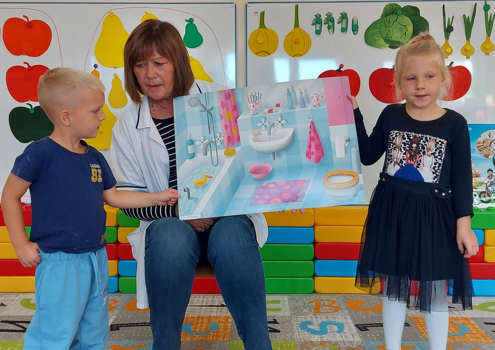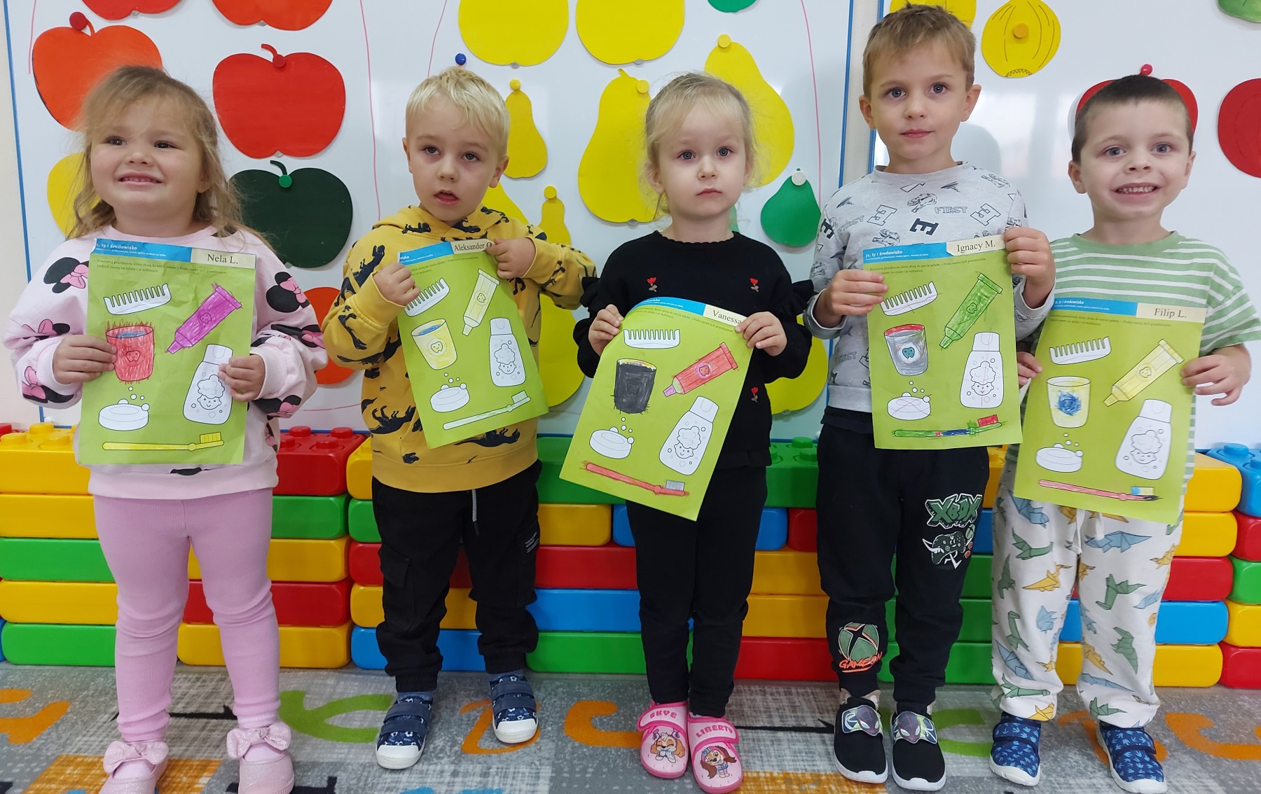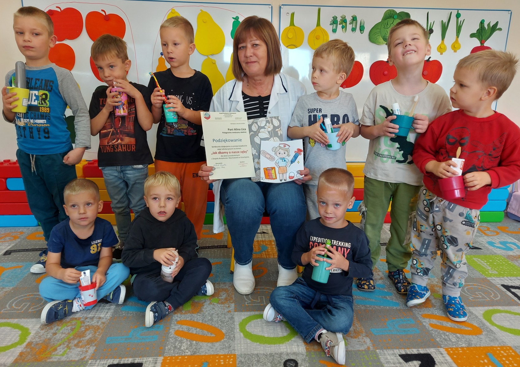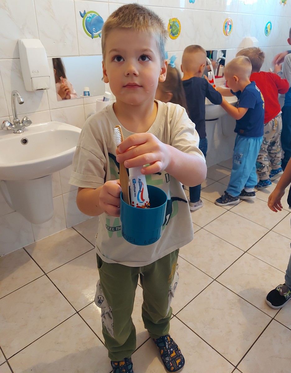 Dzieci dowiedziały się, w jaki sposób i kiedy myjemy zęby, aby były piękne i zdrowe, które produkty wzmacniają zęby, jakie są dla nich szkodliwe oraz jak powstaje próchnica, że występowanie próchnicy ma związek ze spożywaniem pokarmów słodkich. Cukier z pożywienia kontaktujący się bezpośrednio z powierzchnią zębów, wpływa na zmianę naturalnie występującej w jamie ustnej flory bakteryjnej. Pani pielęgniarka zachęcała dzieci do leczenia zębów mlecznych u stomatologa, higieny jamy ustnej i zdrowego odżywiania, spożywania dużo owoców i warzyw. Wszystkie dzieci z panią pielęgniarką myły zęby w przedszkolnej łazience zgodnie z ustalonymi zasadami prawidłowego szczotkowania i przestrzegania kultury osobistej.