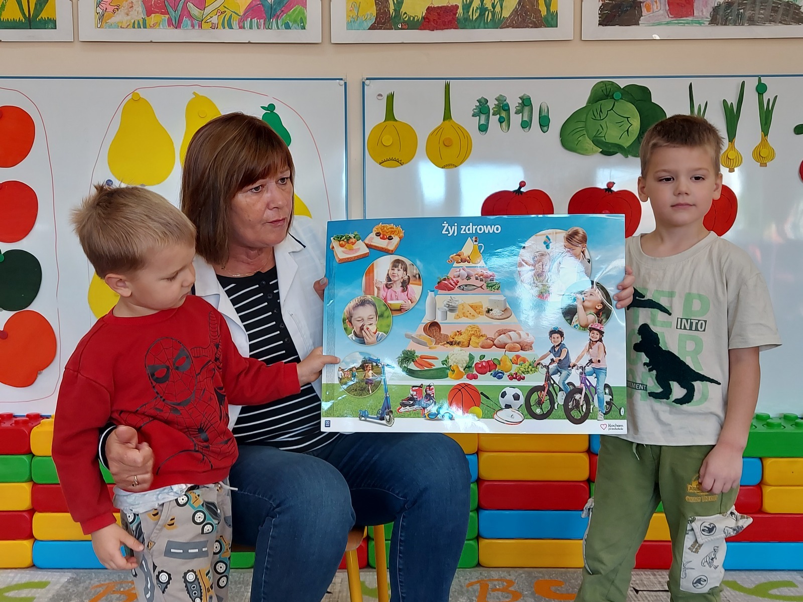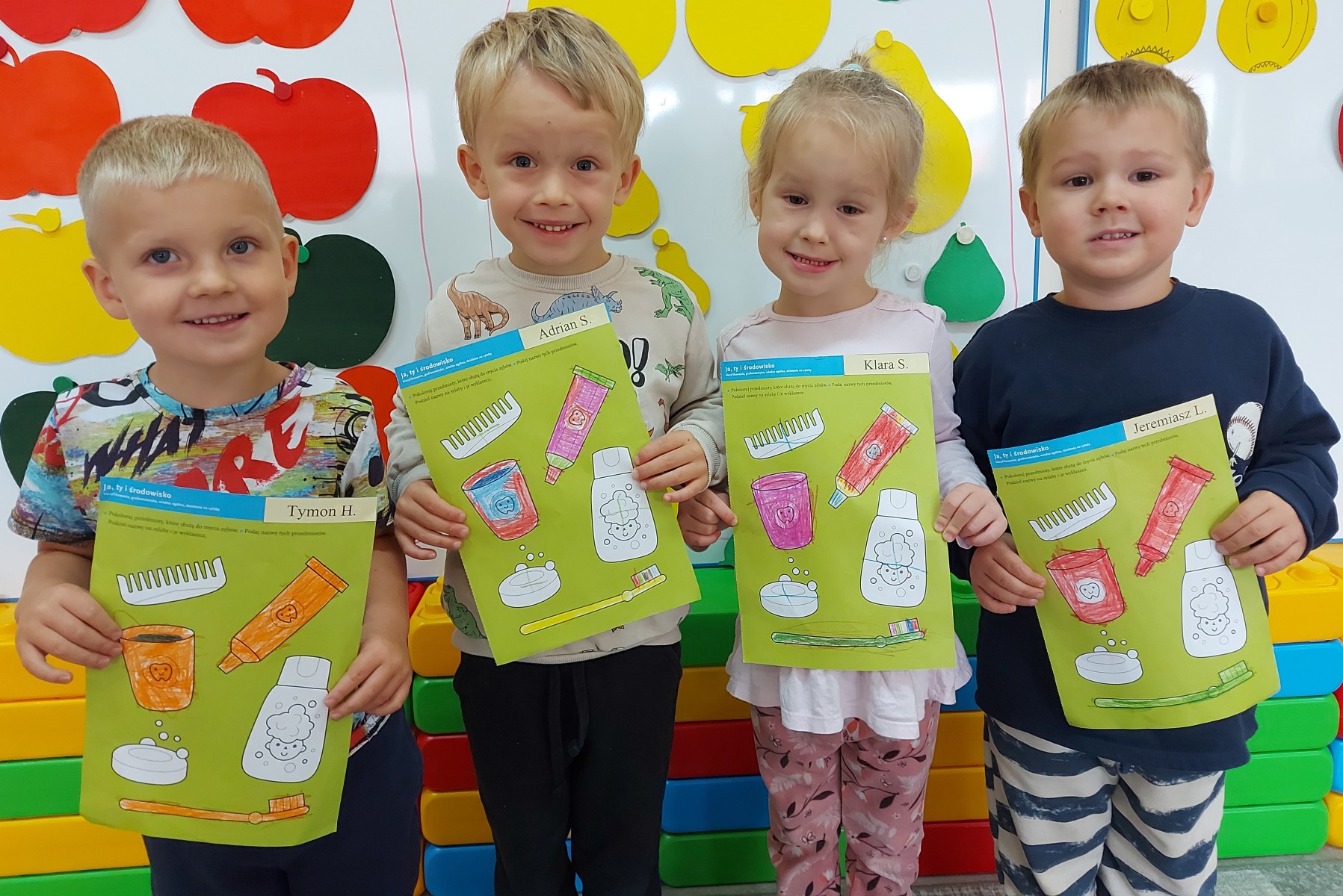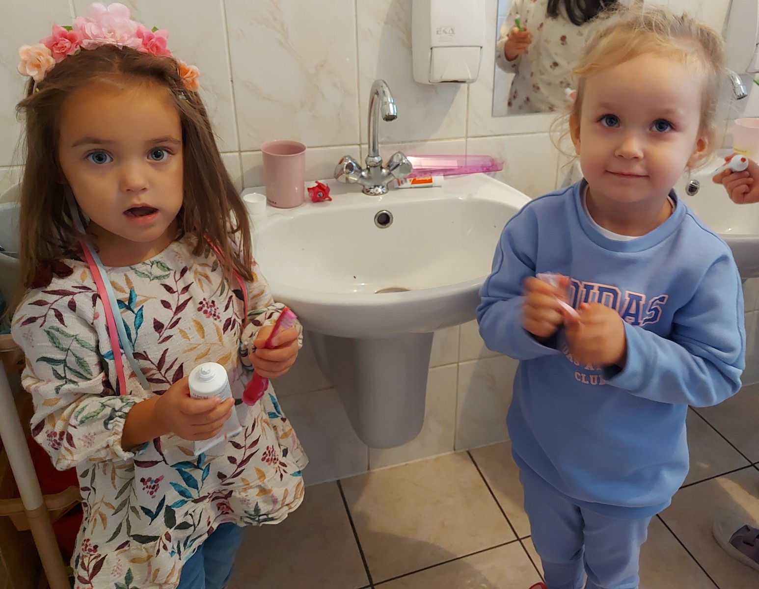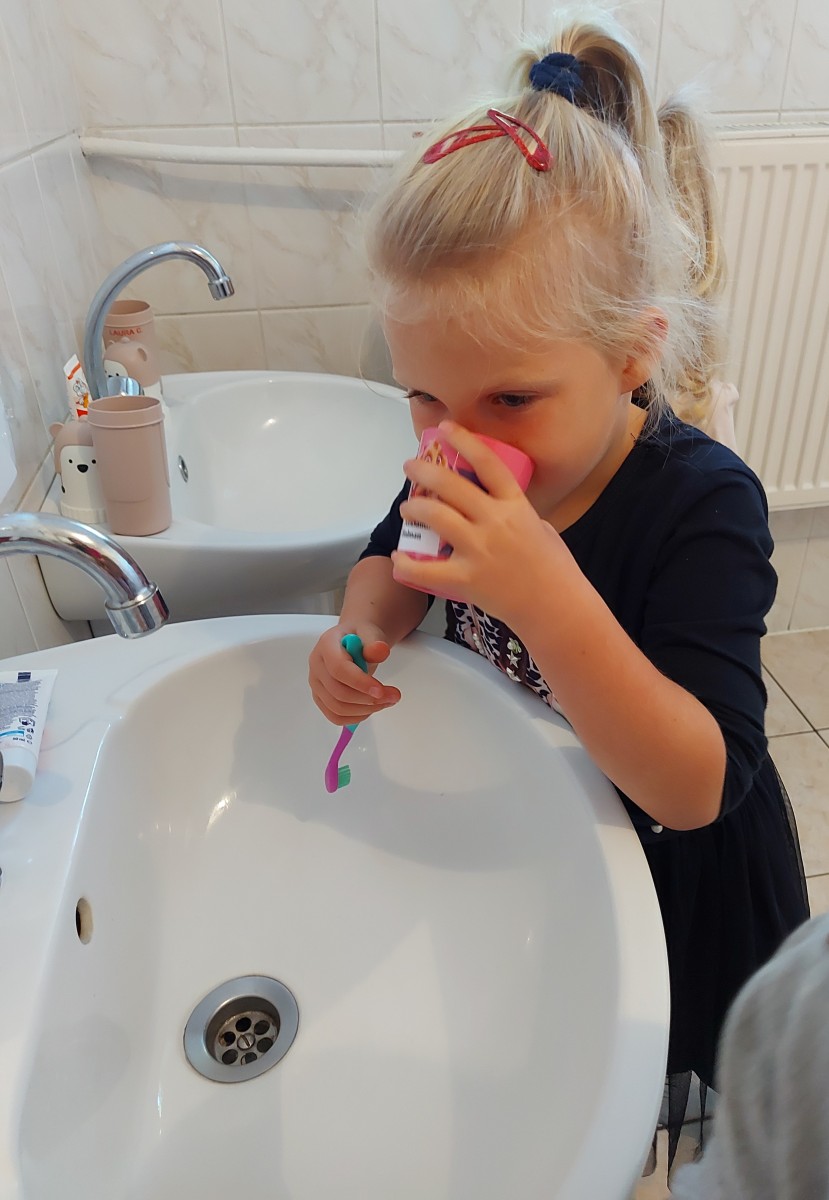Dzieci dowiedziały się, w jaki sposób i kiedy myjemy zęby, aby były piękne i zdrowe, które produkty wzmacniają zęby, jakie są dla nich szkodliwe oraz jak powstaje próchnica, że występowanie próchnicy ma związek ze spożywaniem pokarmów słodkich. Cukier z pożywienia kontaktujący się bezpośrednio z powierzchnią zębów, wpływa na zmianę naturalnie występującej w jamie ustnej flory bakteryjnej. Pani pielęgniarka zachęcała dzieci do leczenia zębów mlecznych u stomatologa, higieny jamy ustnej i zdrowego odżywiania, spożywania dużo owoców i warzyw. Wszystkie dzieci z panią pielęgniarką myły zęby w przedszkolnej łazience zgodnie z ustalonymi zasadami prawidłowego szczotkowania i przestrzegania kultury osobistej.