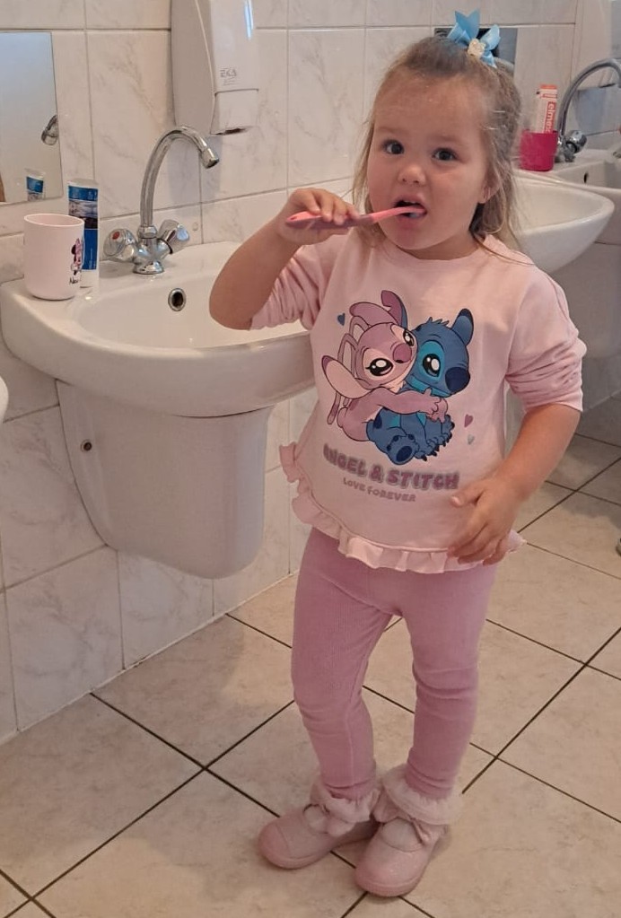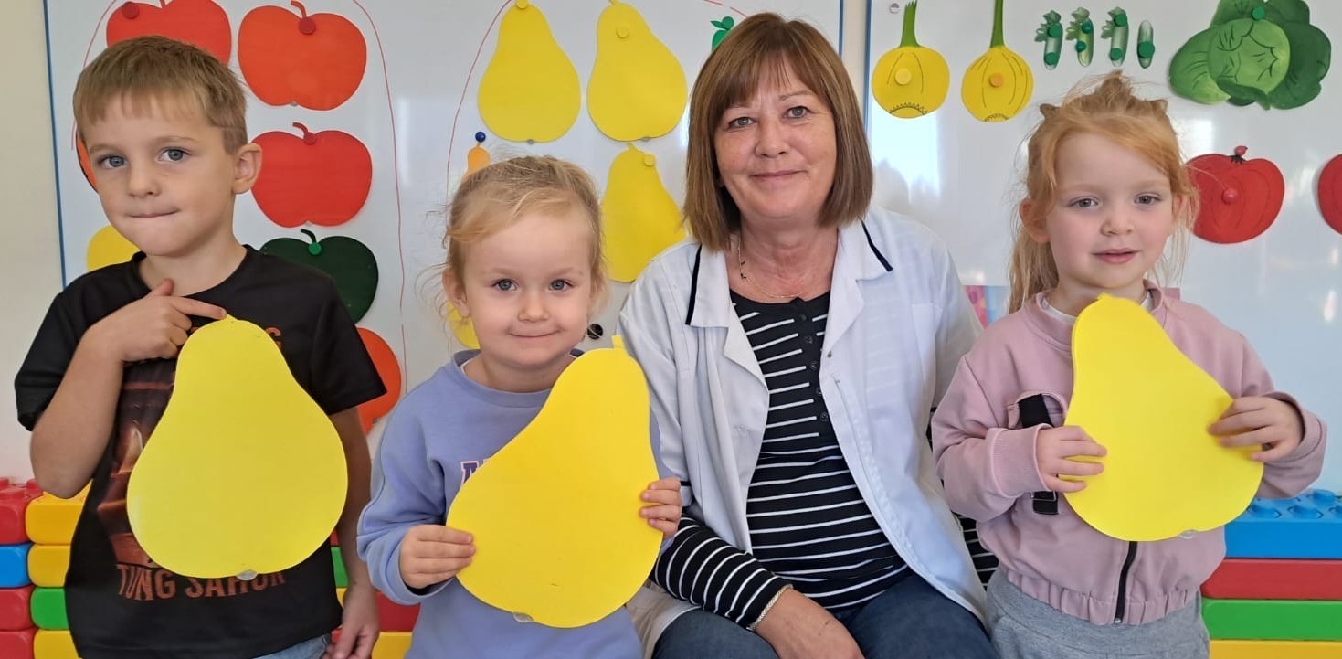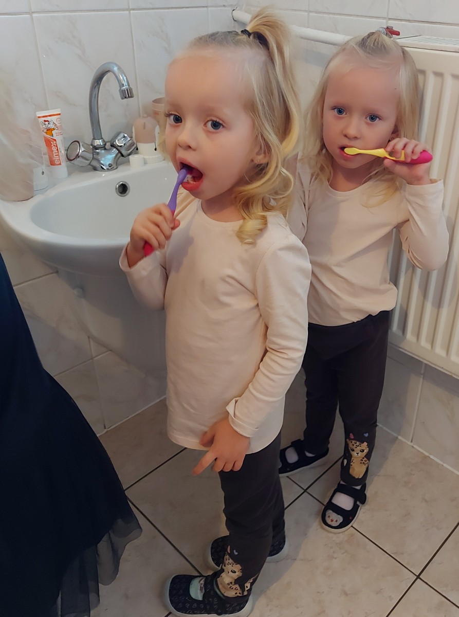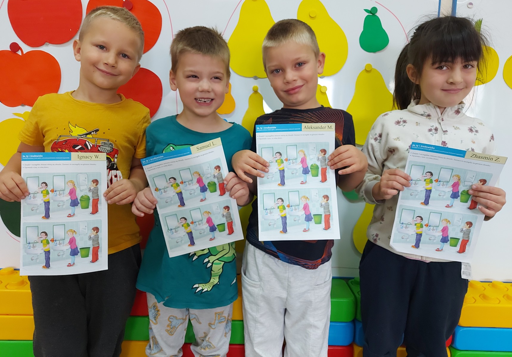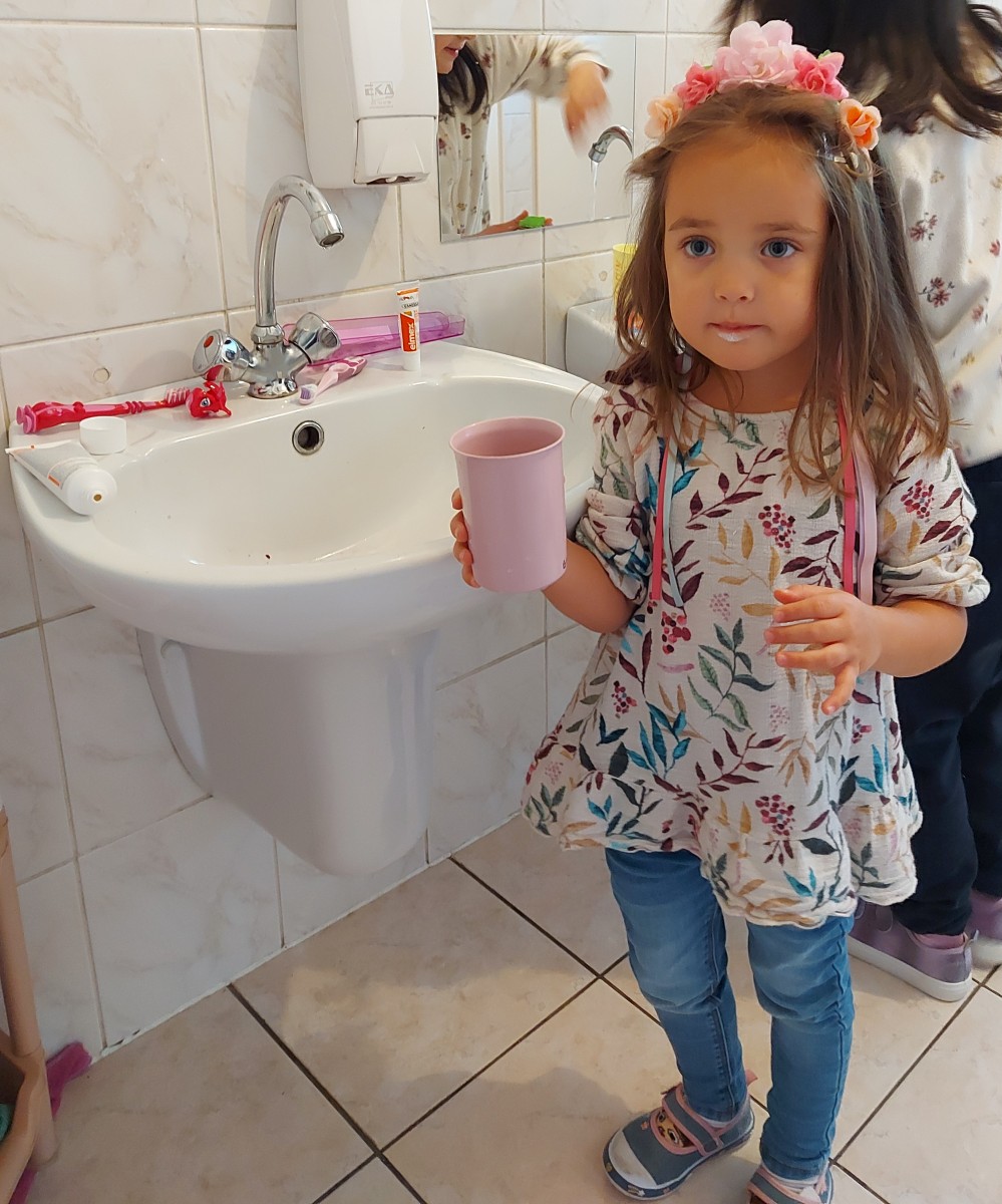 Dzieci dowiedziały się, w jaki sposób i kiedy myjemy zęby, aby były piękne i zdrowe, które produkty wzmacniają zęby, jakie są dla nich szkodliwe oraz jak powstaje próchnica, że występowanie próchnicy ma związek ze spożywaniem pokarmów słodkich. Cukier z pożywienia kontaktujący się bezpośrednio z powierzchnią zębów, wpływa na zmianę naturalnie występującej w jamie ustnej flory bakteryjnej. Pani pielęgniarka zachęcała dzieci do leczenia zębów mlecznych u stomatologa, higieny jamy ustnej i zdrowego odżywiania, spożywania dużo owoców i warzyw. Wszystkie dzieci z panią pielęgniarką myły zęby w przedszkolnej łazience zgodnie z ustalonymi zasadami prawidłowego szczotkowania i przestrzegania kultury osobistej.
