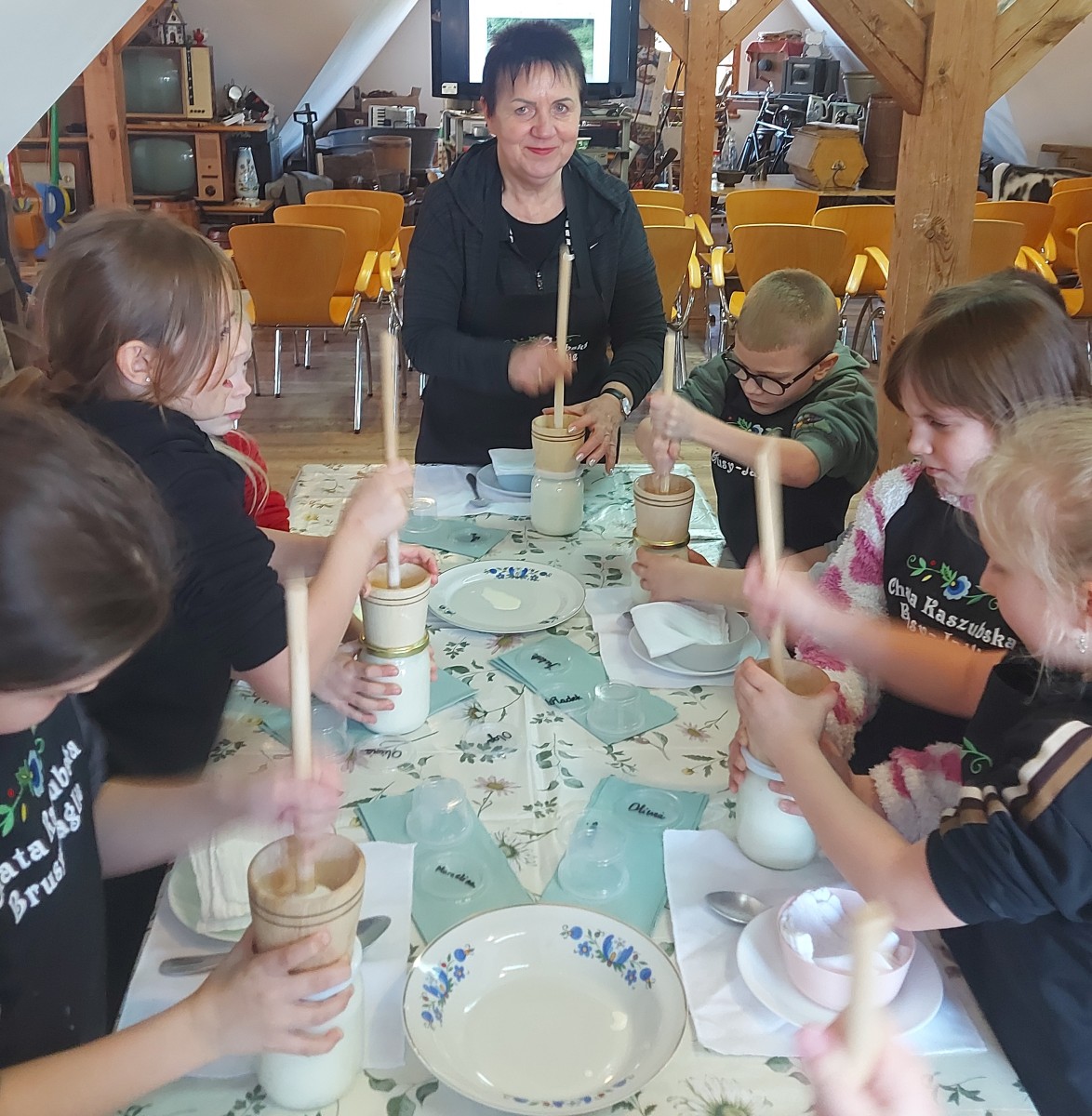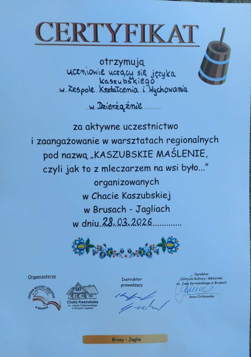 Ciekawą formą zapamiętania wiadomości był test końcowy, który wzbudził wiele pozytywnych emocji, a „maślenie” o historii i tradycji regionu sprawiło wszystkim wiele radości i satysfakcji. Warsztaty były też zachętą do poznawania i utrwalania słownictwa kaszubskiego: mlékò, karwa, smiotanã, mléczëzna, czerzanka, maselnica, serzô wòda, platizer, klepajk, lãpa i wiele innych wyrazów, odpowiedzi na pytania i przysłów. Wszyscy uczestnicy otrzymali certyfikat za aktywne uczestnictwo w warsztatach regionalnych.