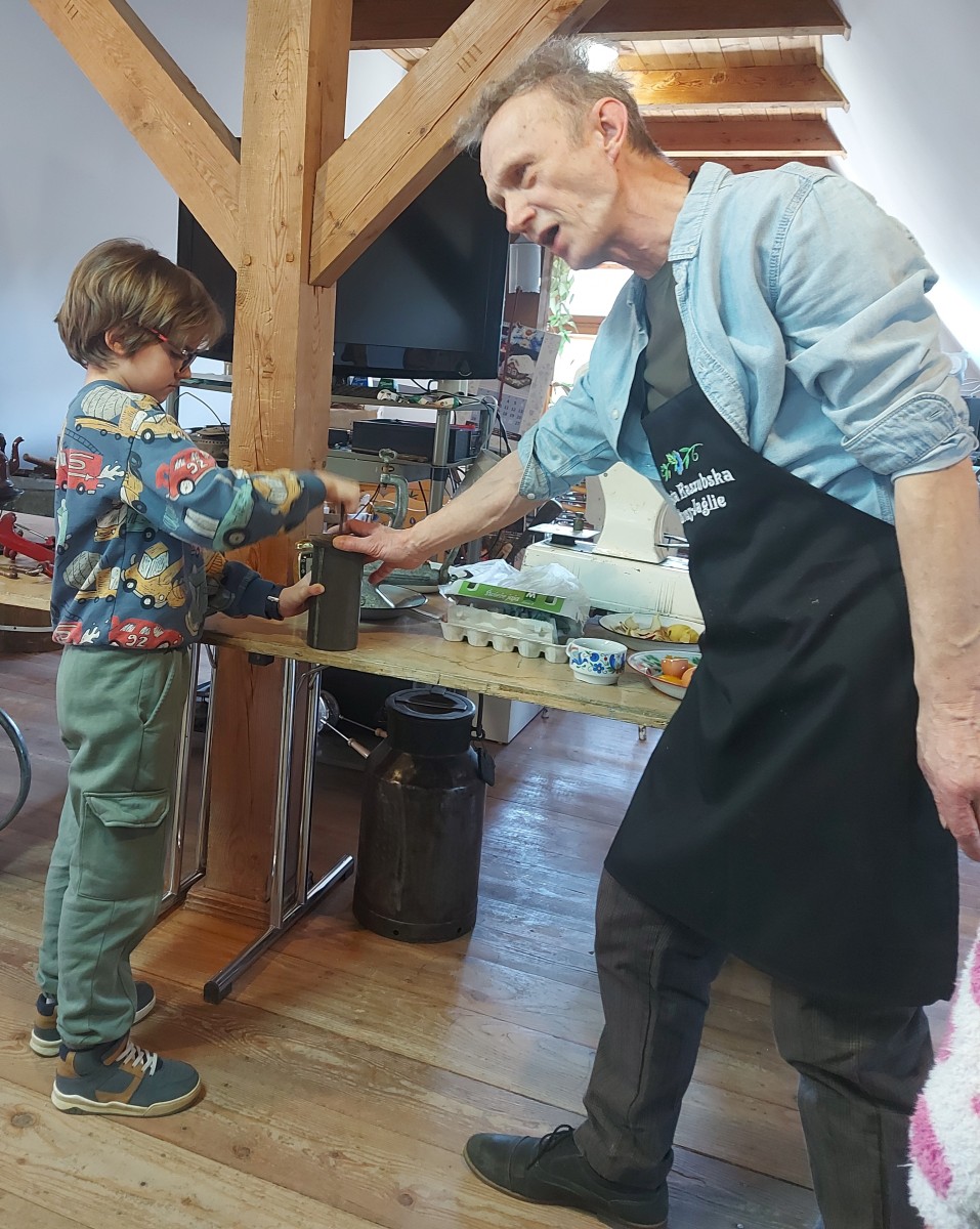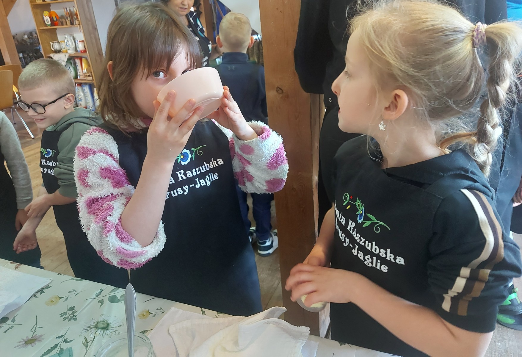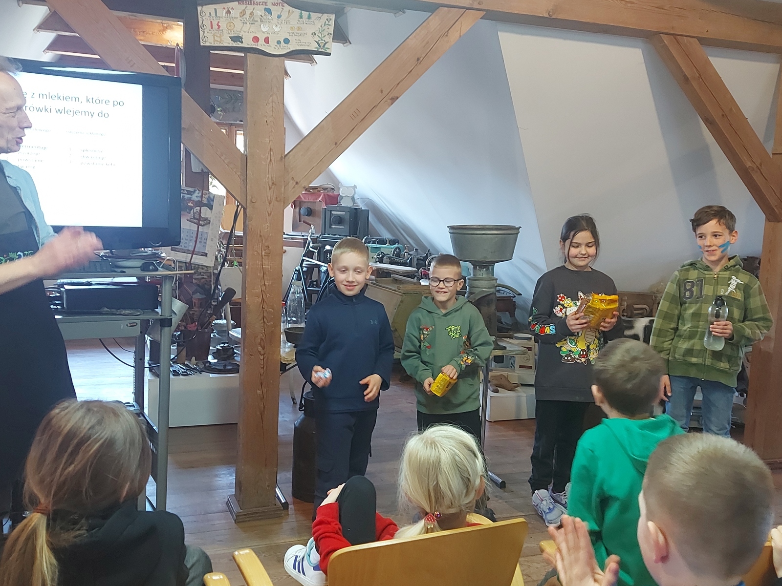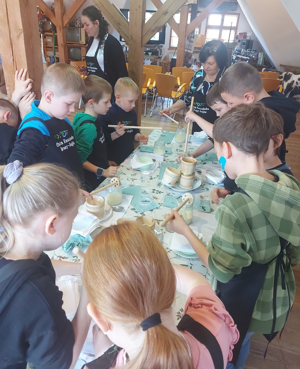 Podczas pierwszych zajęć dzieci dowiedziały się, w jaki sposób dawniej wykorzystywano mleko oraz jak powstawały z niego różne produkty. Poznały tradycyjne metody wytwarzania masła oraz narzędzia, których używano w gospodarstwach domowych, np. centrefuga, konew. Największą atrakcją warsztatów była część praktyczna, od ubijania śmietany, aż do powstania gotowego produktu. Uczniowie samodzielnie wykonywali masło, a swoje własnoręcznie wykonane dzieła w specjalnie przygotowanych pojemnikach zabrali do domu.