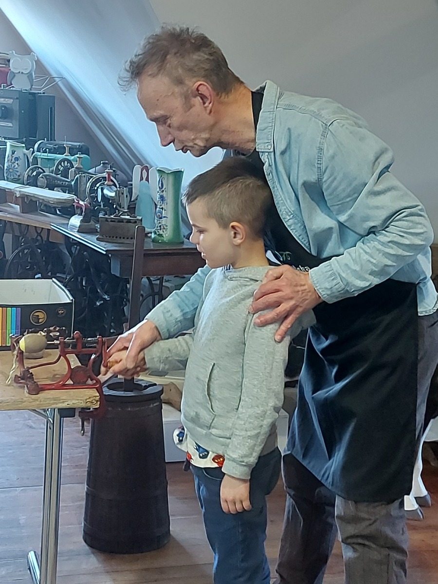 Na drugich zajęciach dzieci poznały dawne czasy bez elektryczności. Celem zajęć było poznanie dawnych przedmiotów codziennego użytku, które nie wymagały prądu. Warsztaty miały charakter interaktywny – dzieci mogły samodzielnie używać wybranych eksponatów, takich jak żelazko na duszę, ręczny młynek do kawy, wyciskarka do soków, ręczna szlifierka do ostrzenia noży, ubijaczka do piany z jajek i inne.
